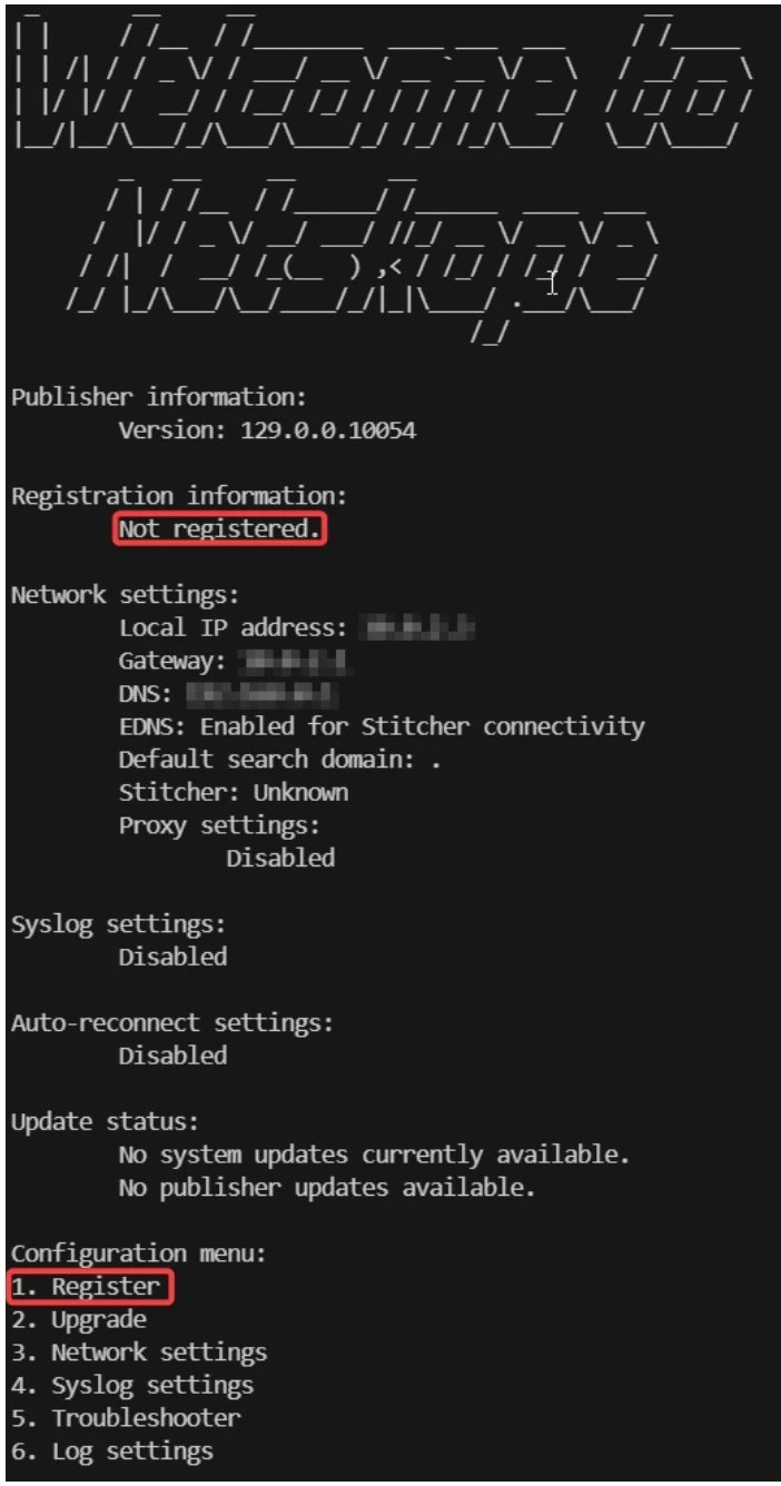 Step #2 - From the Publisher configuration menu, select option 7 to exit to the command prompt.