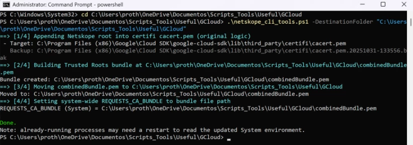 After completion, the Netskope root certificate authority (rootCA) will be attached to the Google SDK certificate bundle, and the REQUESTS_CA_BUNDLE variable will be modified/created, with the "DestinationFolder" defined in step 5.