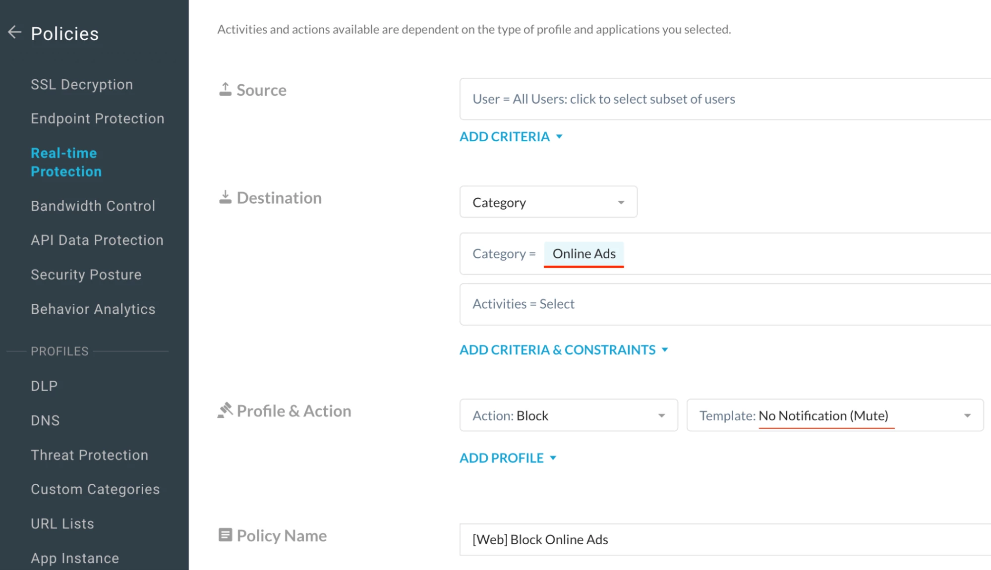- Blocking traffic to the ‘Online Ads’ URL category is one of Netskope’s best practices, typically implemented with a ‘Mute’ notification to prevent disruptive pop-ups for end-users.