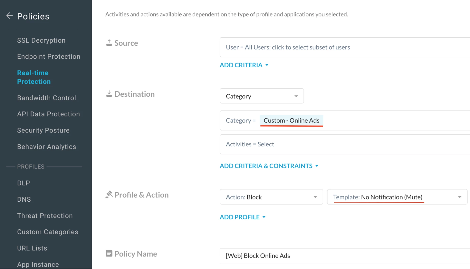 Step 2: Replace the web category in the existing Realtime Protection policy from Online Ads to Custom – Online Ads