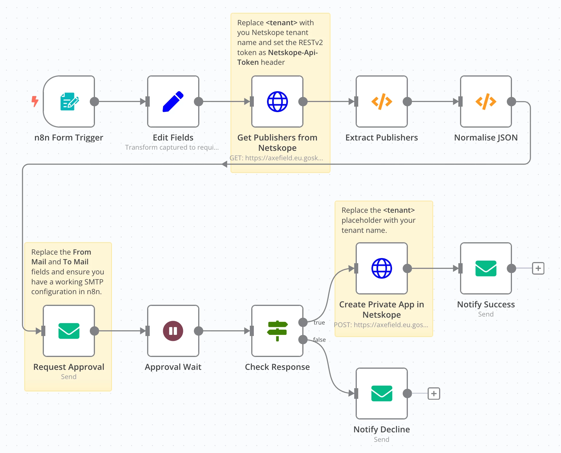 "html": "=<p>New ZTNA Application Request</p>\n<p>\nApplication: {{ $('Normalise JSON').item.json.app_name }} has been successfully created on Netskope.\n</p>\n\n",