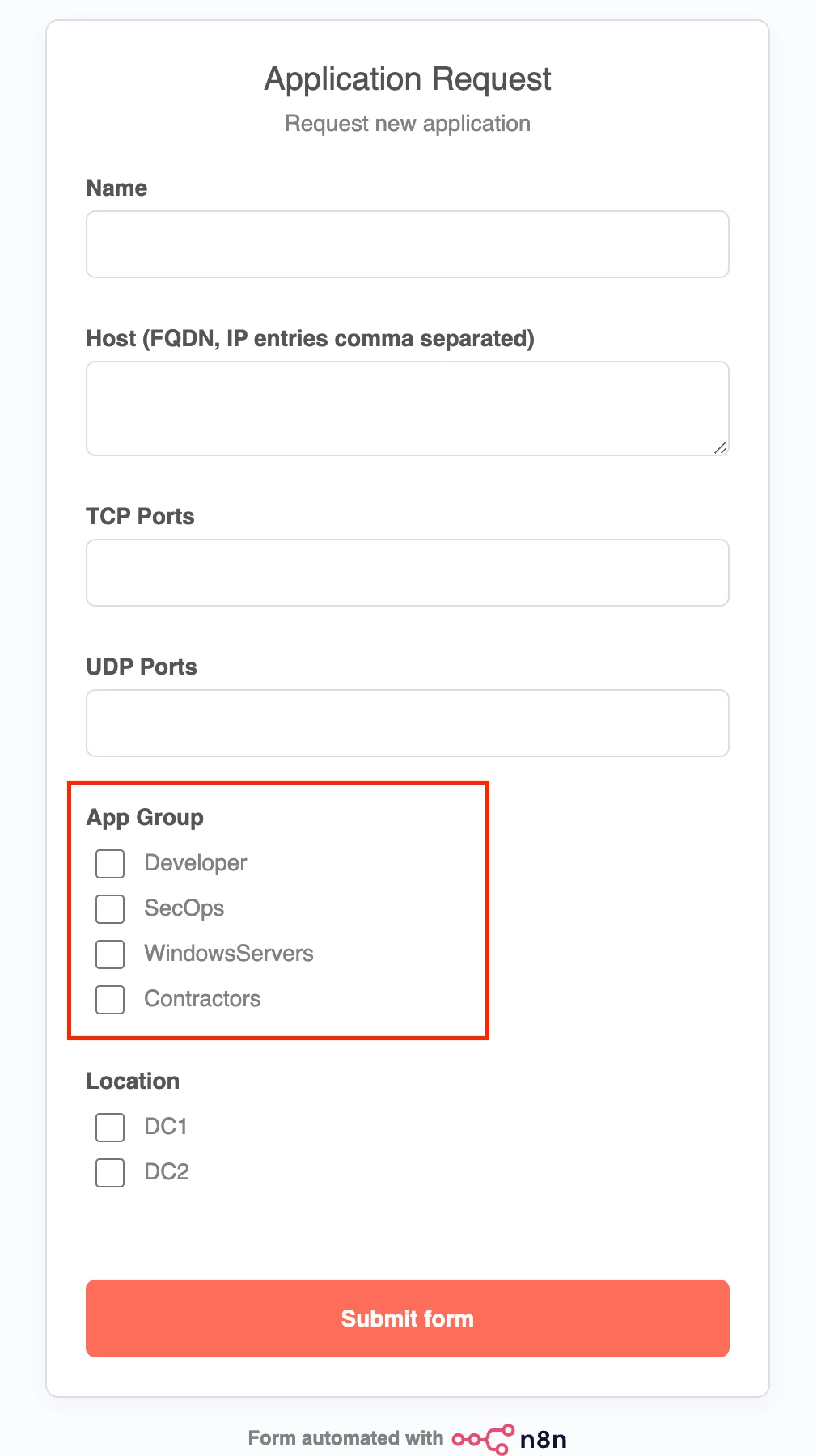 "html": "=<p>New ZTNA Application Request</p>\n\n<p>\n<ul>\n <li>Application: {{ $json.app_name }}</li>\n <li>Hosts: {{ $json.host }}</li>\n <li>TCP Ports: {{ $('Edit Fields').item.json.protocols.tcp }}</li>\n <li>UDP Ports: {{ $('Edit Fields').item.json.protocols.udp }}</li>\n <li>App Group Tag: {{ $('Edit Fields').item.json.tags }}</li>\n</ul>\n</p>\n\n\n<p>Please approve or decline new application request by clicking <a href=\"{{ $resumeWebhookUrl }}?action=approve\">Approve</a> or <a href=\"{{ $resumeWebhookUrl }}?action=decline\">Decline</a></p> ",