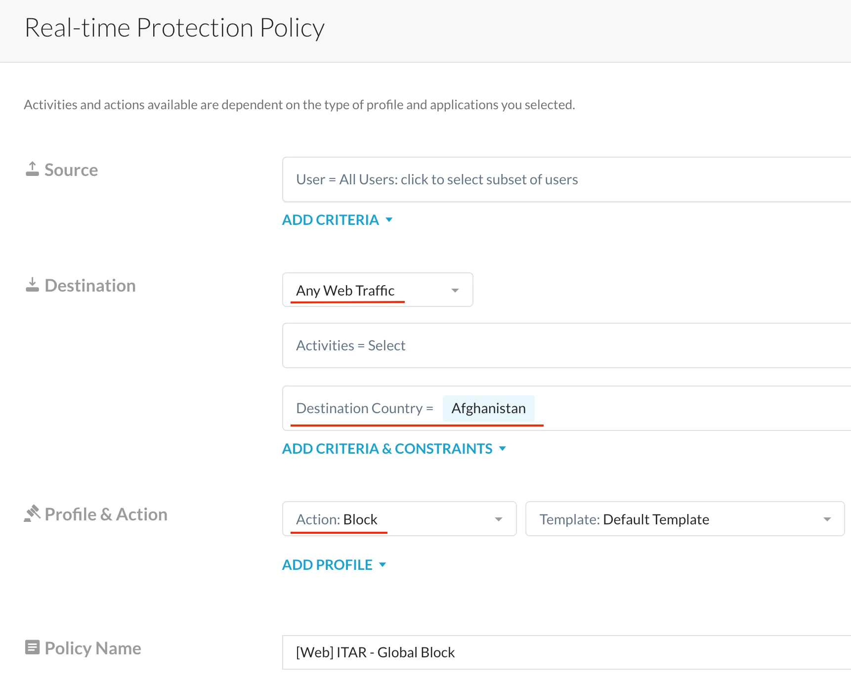 - Before implementing a real-time policy to manage traffic to High-Risk countries, it is advisable to review the list of targeted countries carefully to ensure informed decision-making.