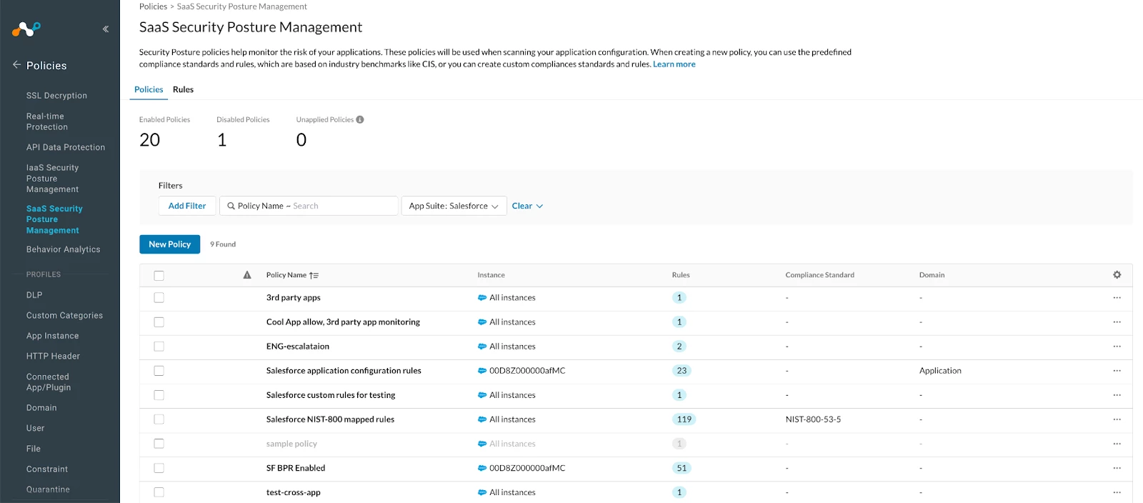 Once your Salesforce instance is onboarded, select a policy for your Salesforce instance. Navigate to Policies→SaaS Security Posture Management, then filter by App Suite to Salesforce. A variety of policies will be presented, from which you may choose based on your requirements, or you may create a new policy.