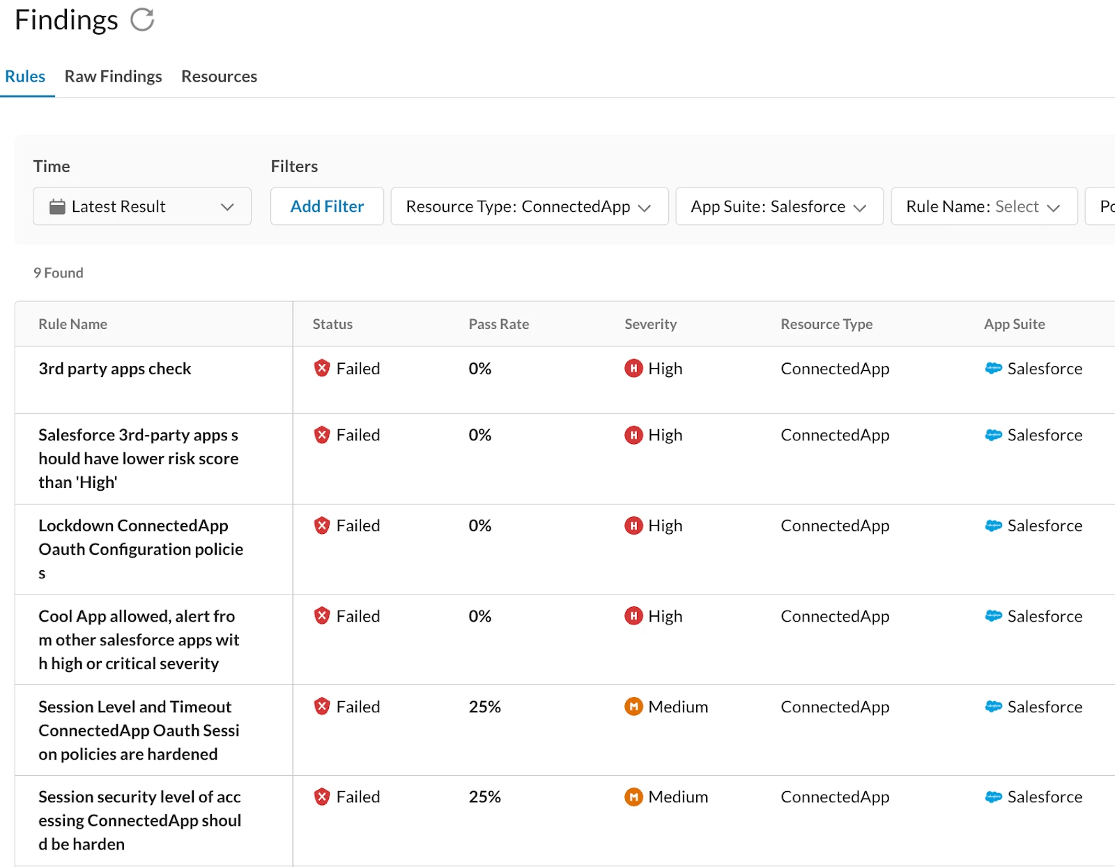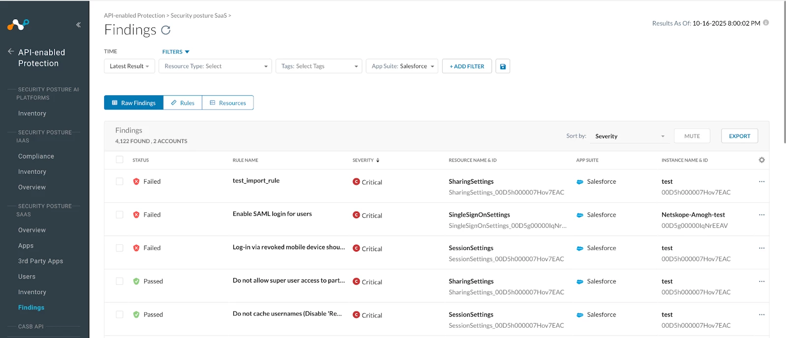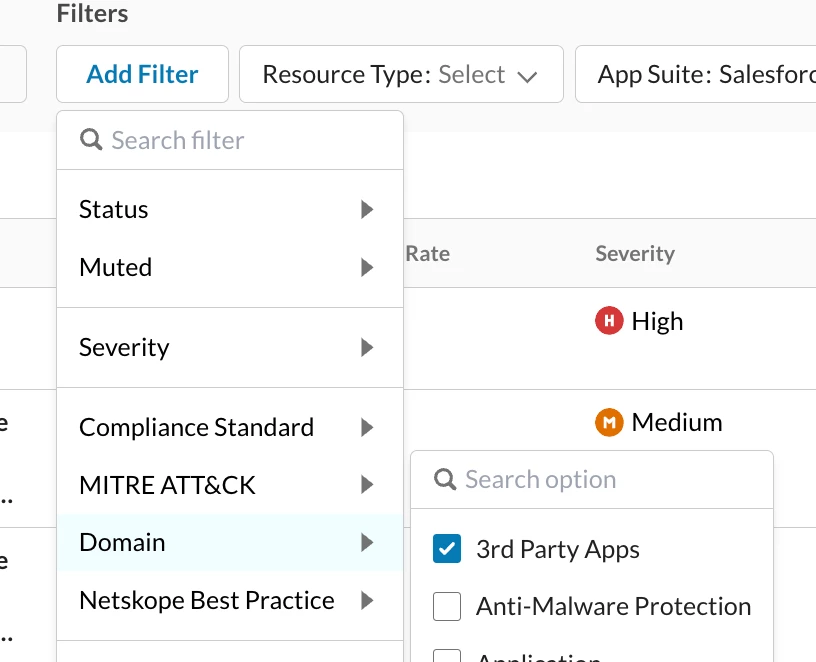 After you have a good idea of your connected apps, the next step into securing your salesforce instance against 3rd party attacks is to delve into specific findings. Findings are the results of rule checks indicating whether your configurations pass or fail security policies. A "failed finding" signifies the detection of a suspected misconfiguration or a potential configuration improvement. These misconfigurations might range from incorrectly set permissions to outdated security protocols and many others, all of which might impact the risk of unauthorized access or data breaches. Therefore, identifying and understanding failed findings is paramount to proactively strengthening your defenses. Netskope SaaS Security Posture Management (SSPM) offers a robust framework, incorporating a comprehensive suite of rules specifically designed for hardening the security of Salesforce environments along with the ability to modify and create your own detections.