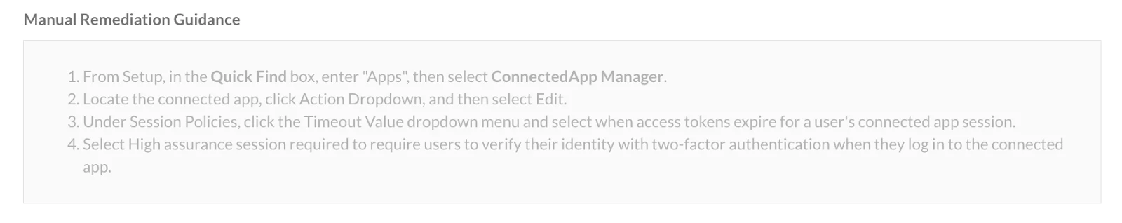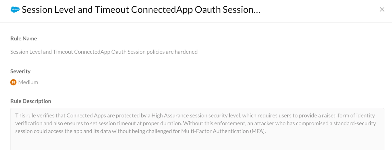 Example: This rule verifies if connected applications are secured by a High Assurance session. It also outlines steps to address identified security misconfigurations and/or reinforce security controls, thereby strengthening defenses against third-party application attacks for a more secure environment.