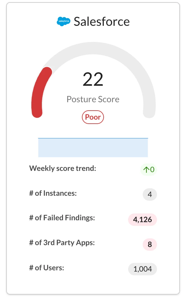 Once that is done you can gain an immediate understanding of your Salesforce security standing. Navigate to API-enabled Protection→Security posture SaaS→Apps. Within this section, you will find a detailed security score specifically for Salesforce, offering a quick overview of its current state. The rating is presented on a scale of 0-100, alongside the number of instances, failed findings, third-party applications, and users. The numbers shown offer quick shortcuts for filtering findings and apps of interest.