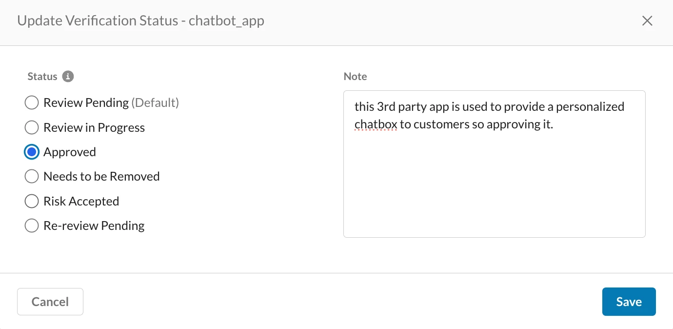 This view provides a risk score based on the permissions requested for each connected application, evaluating the potential risk a third party might pose. For every connected app, you can perform basic vetting workflows by right-click the three dots on the right to select a verification status from options such as "Review Pending", "Review in Progress", "Approved", "Needs to be Removed", "Risk Accepted", or "Re-review Pending." You can also add notes for future reference, helping to ensure no unwanted apps are present in your Salesforce instance and providing clear explanations for any suspicious-looking applications.