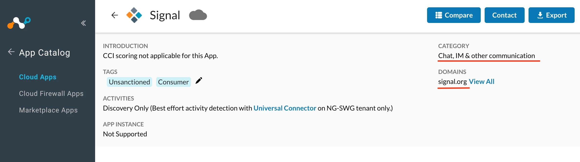 - As of Oct 03, 2025, Netskope recognizes Signal as a cloud application. However, there is currently no predefined cloud app connector available for Signal within the Netskope platform.
