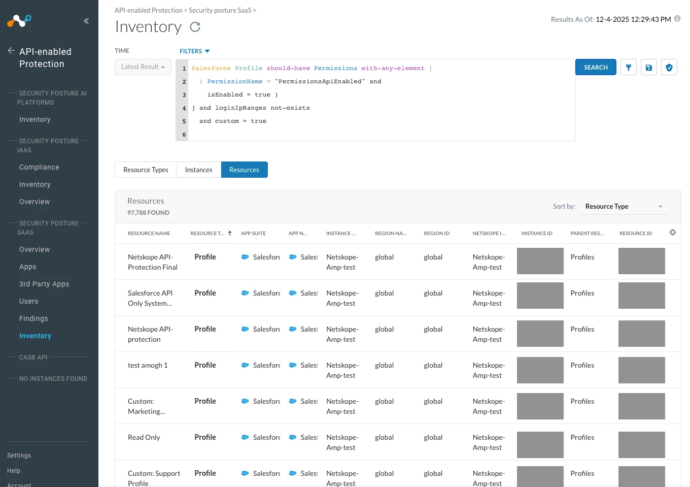 - Netskope SSPM has visibility to the profile objects and can alert you for any profiles capable of using API’s without IP Address range restrictions set up. For example, you can use the following NGL in the Inventory Search to hunt for user-created API-capable user profiles without IP Login Restrictions configured to them: